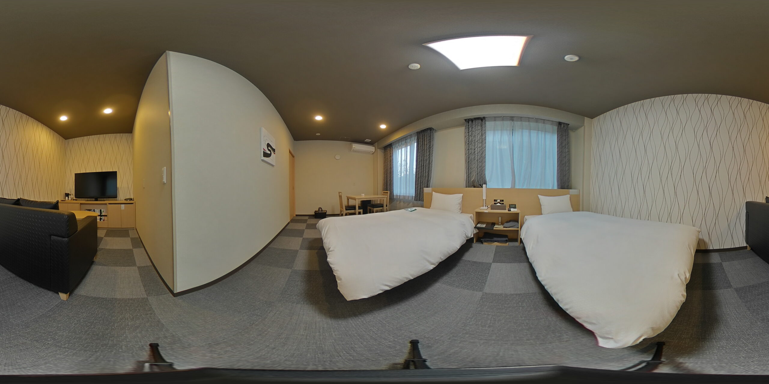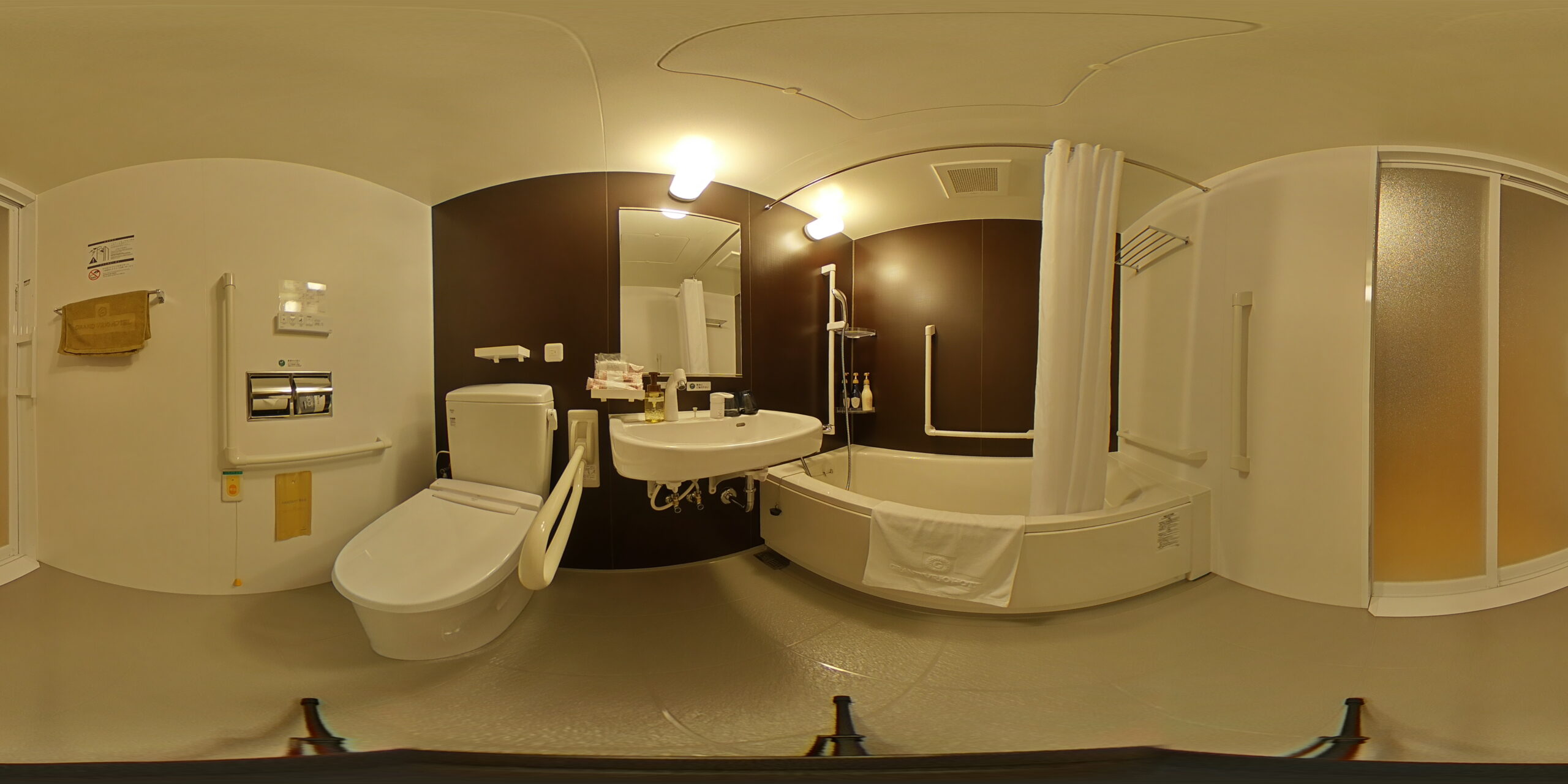 館内はバリアフリーに配慮されており、特に「アクセシブルツインルーム」は、車椅子(車いす)をご利用の方も安心の設計。通路が広く、室内は段差なしのフラットな構造です。共用部には多目的トイレも完備されています。