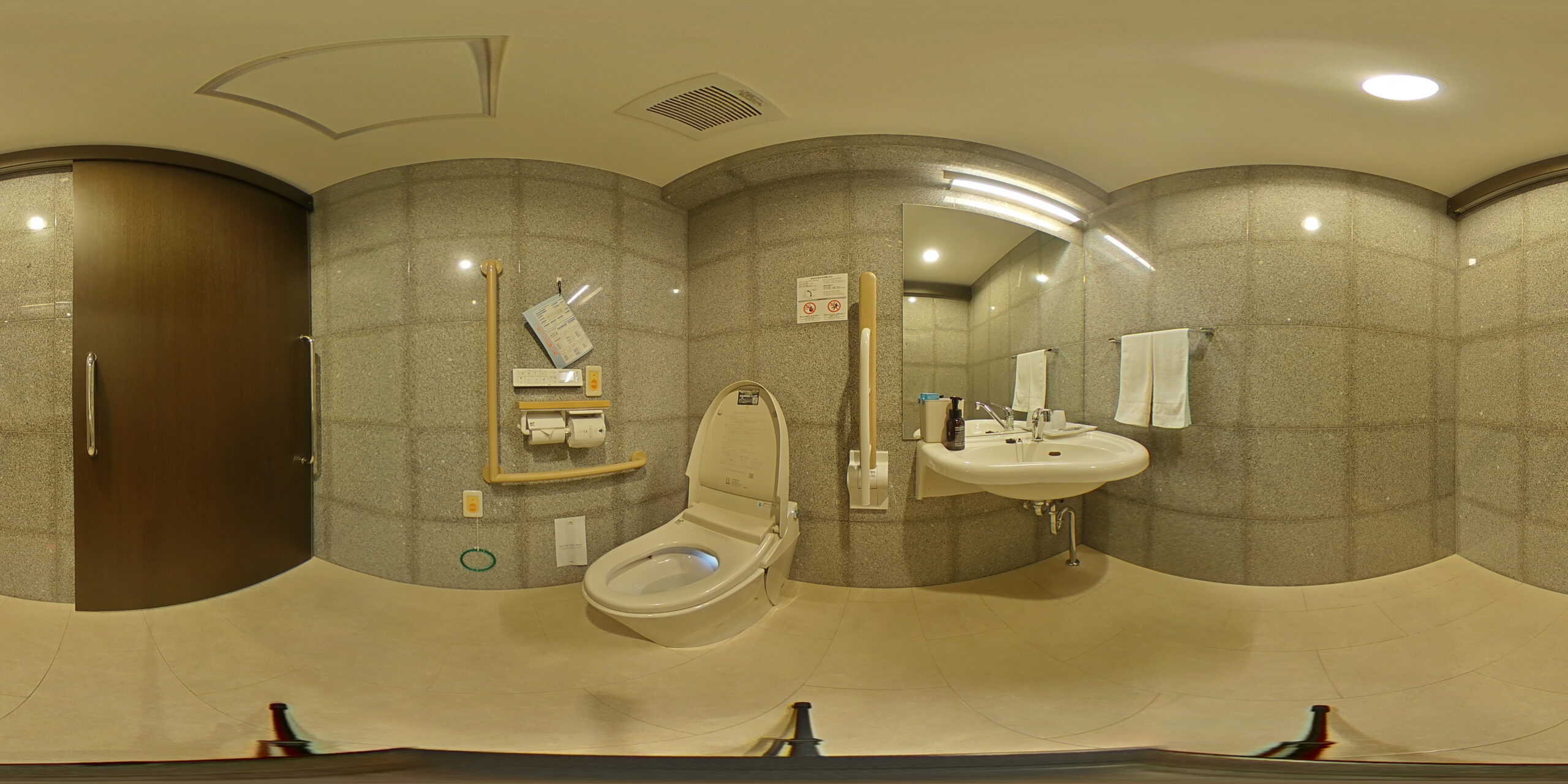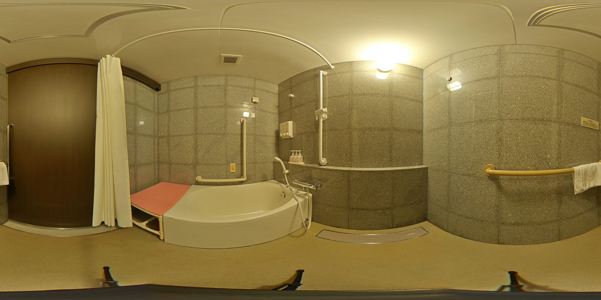 特に注目したいのが、「ハートフルツインルーム」です。室内は車椅子でもスムーズに動けるよう、入り口から水回りまで段差なしのフラットな設計。浴室には手すりを設置し、車椅子利用可な広々としたスペースを確保しています。館内の多目的トイレなど、車椅子でも安心して過ごせる設備が充実しています。