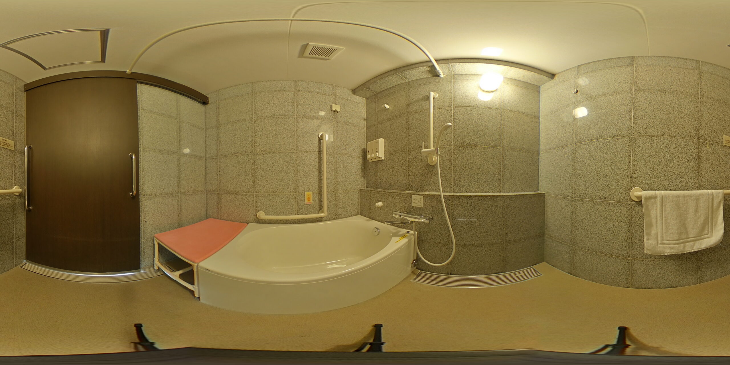 特に注目したいのが、どなたでも安心して過ごせるユニバーサルデザインへのこだわりです。館内には、車いすをご利用の方も快適に宿泊できる「ハートフルルーム®B」を完備。広々とした室内は段差なしのフラット設計で、バスルームには手すりも設置されています。